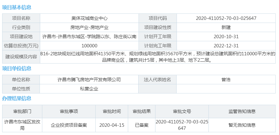 大河财立方消息 4月15日,据河南省投资项目在线审批监管平台发布,许昌奥体花城商业中心项目获许昌市东城区发改局备案。