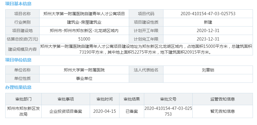 大河财立方消息 4月15日,据河南省投资项目在线审批监管平台发布,郑州大学第一附属医院自建青年人才公寓项目获郑州市郑东新区发改局备案。