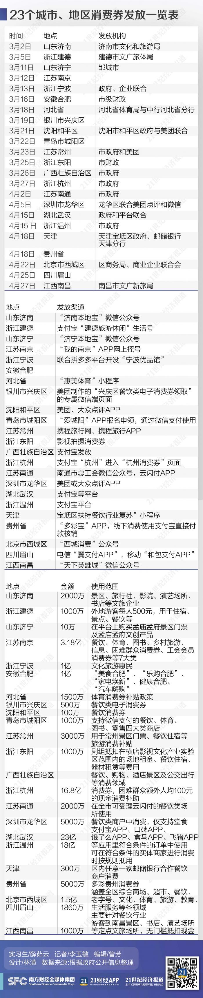 21世纪经济报道记者根据官方公布的数据不完全统计,截至2020年4月27日,已有山东、浙江、贵州、江苏、安徽、湖北、湖南、河北、四川、北京、江西、宁夏、辽宁、广西、重庆、广东等省市共计52个城市和地区宣布向居民发放消费券,总金额从10万元到20多亿元不等。