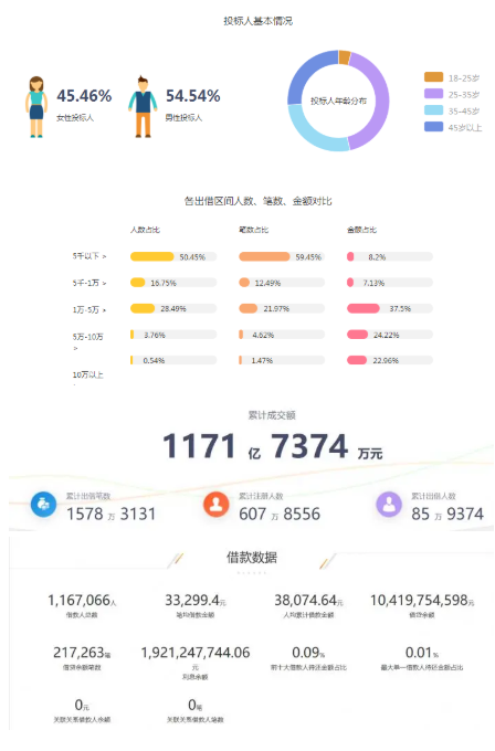 截止至2020年04月30日,小牛在线累计成交金额达1171.74亿元。平台借款人总数为116.71万人,借贷余额高达104.20亿。逾期金额为0。累计出借1578.31万笔,累计注册人数607.85万,累计出借人数85.94万。