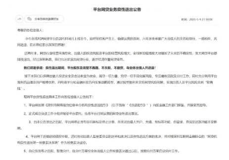 5月9日,小牛在线P2P网贷平台在其官网发布《平台网贷业务良性退出公告》称,近两年来网贷行业经营环境恶化,出借人的投资风险及平台的经营风险增大,全球新冠疫情极大地增加了未来的不确定性,各大网贷平台都陆续退出,经过深思熟虑,公司也决定退出网贷行业,逐步结清存量网贷业务。