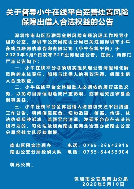 对此,5月10日,深圳市公安局南山分局发布督导公告称,深圳市南山区互联网金融风险专项治理工作领导小组办公室、深圳市公安局南山分局已有所关注,将督导小牛在线平台妥善处置风险,保障出借人合法权益。
