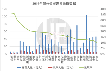 2019年,河南高考报名人数超百万,是其他几个中部省份人数2倍还多。虽然录取人数也相对较多,但录取率仅为12.5%左右,在全国都排名靠后。
