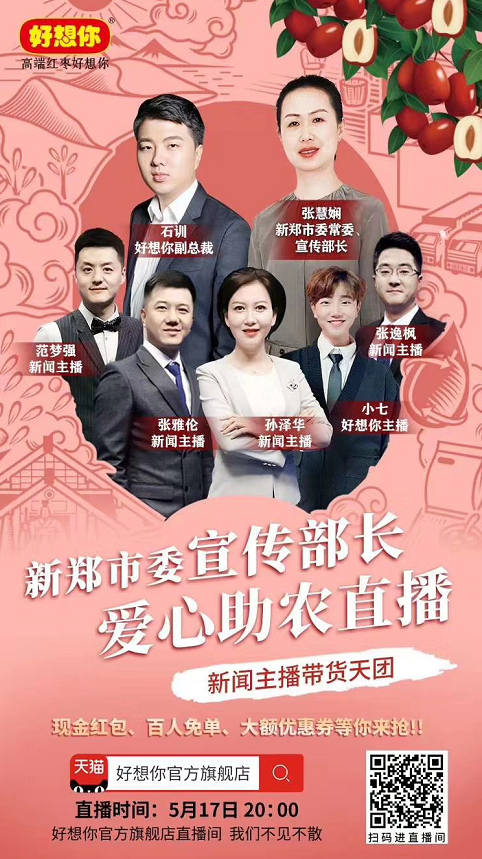 为消弭疫情的影响,进一步畅通农副产品销售渠道,推动特色农产品“走出去”,5月17日晚8点,新郑市委常委、宣传部长张慧娴将携手好想你“红枣少帅”石训一起直播带货。届时,张慧娴将倾情推介新郑市土特产,展示新郑城市形象。