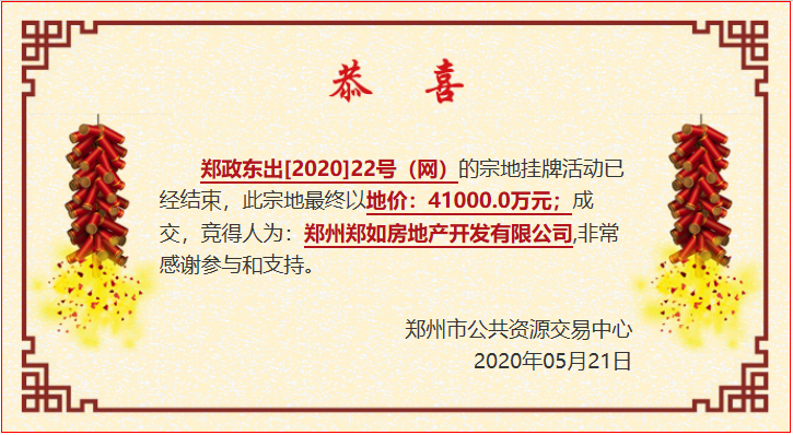 郑政东出〔2020〕22号(网)位于郑东新区如意河东二街南、如意东路东,土地性质为50年零售商业、批发市场、餐饮、旅馆、商务金融、文化设施、体育、医疗卫生、社会福利用地,使用面积31065.01㎡(折合为46.60 亩),容积率<2.0,起始价41000万元。起始地价880万元/亩,起始楼面价4399元/㎡。最终,该地块被郑州郑如房地产开发有限公司以起始价41000万元摘得。