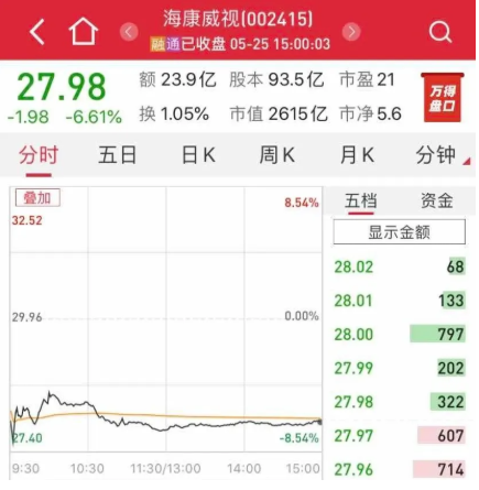 值得注意的是,5月25日,也就是海康威视公布龚虹嘉减持公告后的第一个交易日,海康威视股价大跌6.61%,市值相较5月22日收盘蒸发了185亿元。