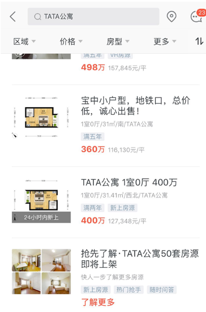 TATA公寓就是其中之一。链家APP的数据显示,TATA公寓房源下架前的挂牌价在每平方米8万至15万元之间。而去年6月,面积在30平方米左右的TATA公寓房源,成交均价仅在每平方米7万元左右。