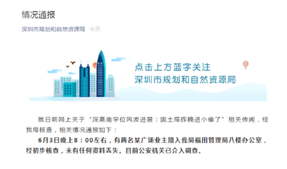 此外,就这一事件,网上还传出了“深高南学位风波进展:国土局昨晚进小偷了”相关传闻。对此,深圳市规划和自然资源局的官方微信在5日发出情况通报:“经我局核查,相关情况通报如下:6月3日晚上8:00左右,有两名某广场业主擅入我局福田管理局八楼办公室,经初步核查,未有任何资料丢失。目前公安机关已介入调查。”