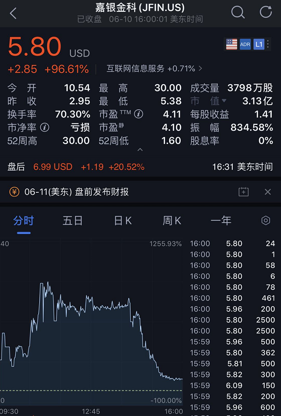 还有一只中概股叫嘉银金科,盘中股价多次触发熔断、一度暴涨逾900%,截至收盘,涨幅骤然缩小,涨超90%,如果投资者跟风买在最高点,损失可能高达80%!