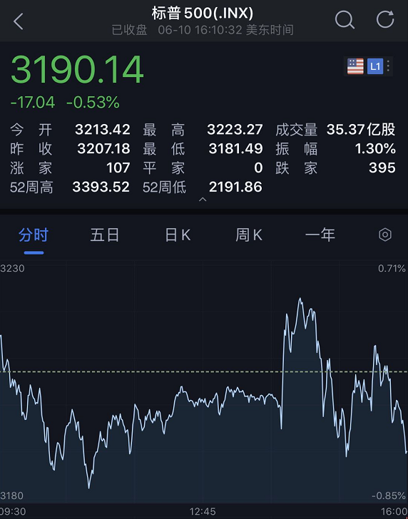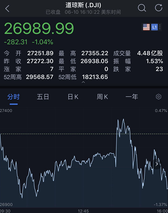 截至收盘,三大股指涨跌不一,道指跌超1%,纳指收涨0.67%,标普500指数收跌0.53%。
