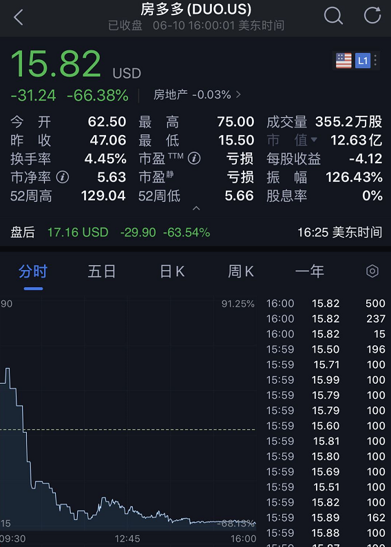 首先是房多多,上一个交易日,房多多盘中一度涨逾1200%,并14次触发熔断,收涨394.85%;6月10日,房多多则从涨到熔断,迅速发展到跌到熔断,走势让人很迷:开盘一度暴涨46%,触及熔断;随后跳水转跌,最多跌64%,截至收盘,暴跌了66.38%,如果不小心跟风买在最高点,可能会一夜亏损近80%!