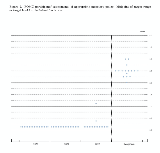 美联储点阵图显示,美联储预计将维持利率在当前水平直至2022年年底。