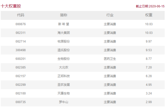 中证指数公司官网显示,国泰中证畜牧养殖指数从沪深A股中选取涉及畜禽饲料、畜禽药物以及畜禽养殖等业务的上市公司股票作为样本股,以反映畜牧养殖相关上市公司股票的整体表现。记者发现,前十大权重股主要包括新希望、牧原股份、温氏股份、正邦科技等养猪龙头上市企业,还有一部分养鸡和疫苗类上市企业,比如圣农发展、生物股份等。