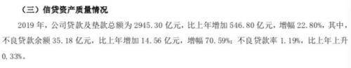 资产方面,据广州银行2019年年报,2019年,该行贷款及垫款总额为2945.30亿元,增幅22.80%,其中,不良贷款余额达35.18 亿元,增幅高达 70.59%;不良贷款率 1.19%,比上年上升 0.33%。