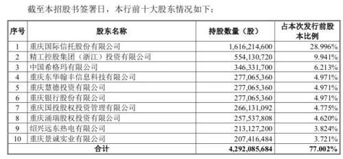 今年6月,重庆银保监局批复同意该行首次公开发行A股股票,发行规模不超过18.58亿股。