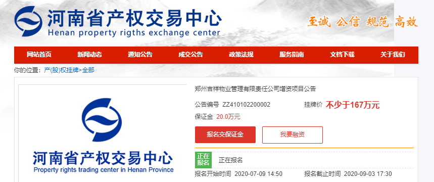 【大河财立方消息】7月10日,记者从河南省产权交易中心获悉,郑州吉祥物业管理有限责任公司增资项目挂牌,挂牌价不少于167万元。