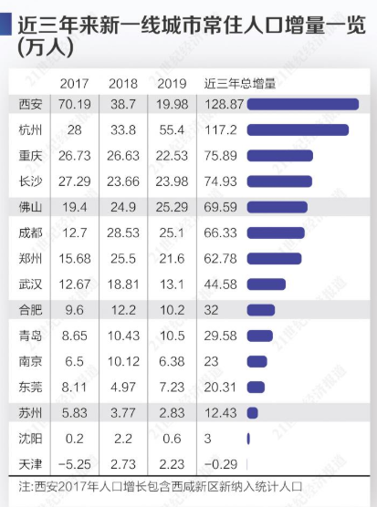 成都、重庆、郑州、长沙、佛山等城市,以及扣除人口被动增长后的西安,近3年常住人口增量都在60万-80万之间。