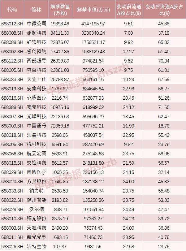 中微公司是解禁规模最大的科创板企业。中微公司此次有1.94亿股解禁,涉及18名限售股股东,解禁股数量占公司总股本36.27%,占流通A股377.27%。以最新收盘价计算,中微公司解禁规模达到414.72亿元,而中微公司总市值1143亿元,流通市值仅110亿元。
