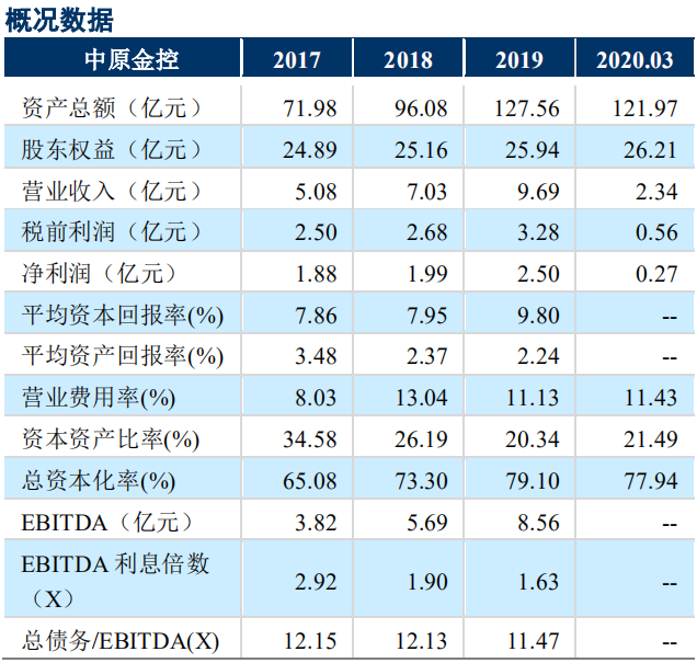数据显示,2019年中原金控实现营业收入9.69 亿元,较上年增长 37.81%;实现净利润2.5亿元。截至2020年3月末,中原金控资产总额121.97亿元,股东权益26.21亿元。