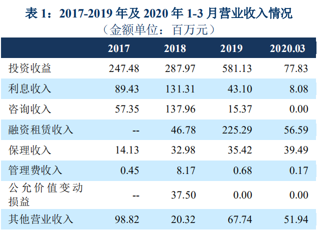 从营业收入的构成来看,投资收益是其主要收入来源。2019年,中原金控通过基金投资、持有的信托产品等实现投资收益5.81 亿元,同比大幅增长101.80%。截至 2020 年 3 月末,中原金控存量基金业务合计 25.88 亿元,存量基金业务包括河南瑞锦投资中心(有限合伙)、商丘交银商发扶贫建设发展基金(有限合伙)和千方美厨(河南)投资基金(有限合伙)。