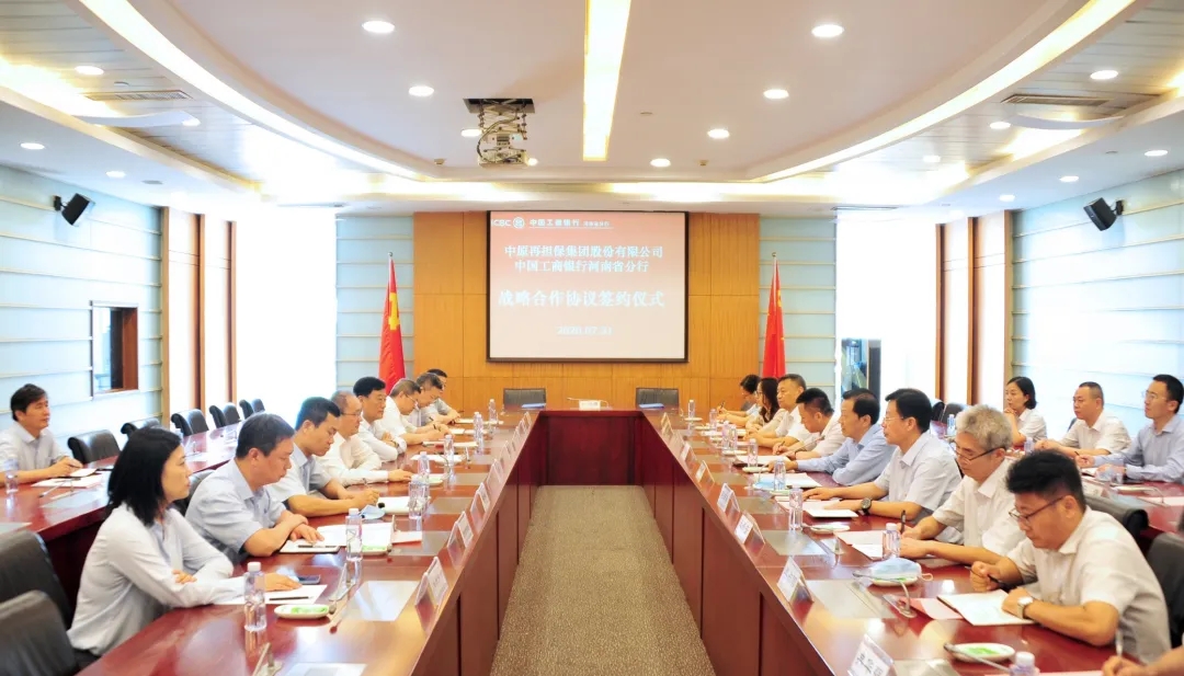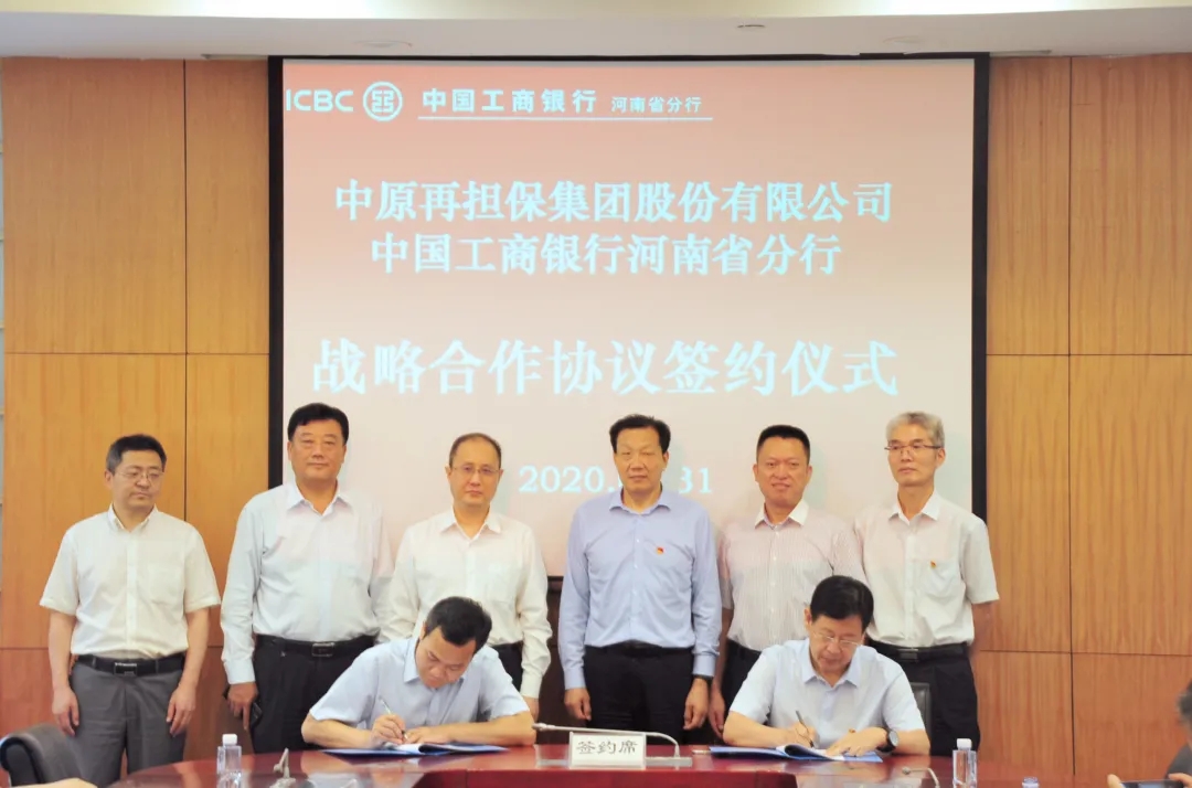 7月31日,中原再担保集团与工商银行河南省分行签订了银担“总对总”批量担保业务合作协议,合作授信金额100亿元。中原再担保集团董事长陈金玉、总经理刘向东,工商银行河南省分行副行长韩强及双方相关人员参加签约仪式。