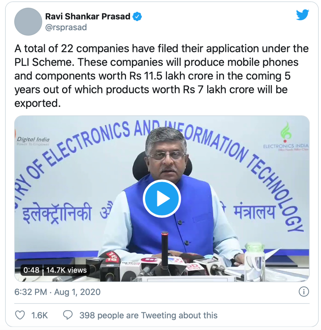 8月1日,印度电子和信息技术部长Ravi Shankar Prasad在推特上表示,三星电子、富士康等苹果的合作伙伴们入选一项智能手机生产激励计划,此举可能在未来五年内将手机行业产值提高到11.5万亿卢比(约1500亿美元)。
