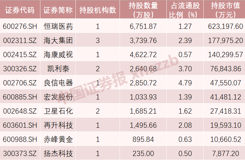 截至目前,社保基金持股市值最多的三家公司是健友股份、艾德生物、长信科技;QFII持股市值最多的三家公司是恒瑞医药、海大集团、海康威视;百亿私募中,冯柳新进龙蟒佰利和乐鑫科技,邓晓峰增持宏发股份,卓利伟新进华峰氨纶,林利军新进富祥药业;海大集团、再生科技、良信电器、创源文化、江龙船艇等多家公司同时被社保基金和QFII持有。