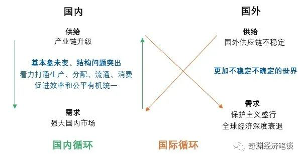 与上述背景一致,2020年5月14日召开的中央政治局常委会会议,基于供给、需求视角首次提出了“双循环”概念:“要深化供给侧结构性改革,充分发挥我国超大规模市场优势和内需潜力,构建国内国际双循环相互促进的新发展格局”。