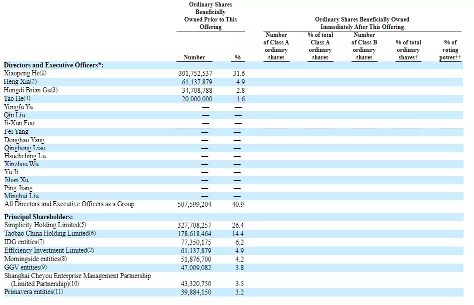 IPO前,小鹏汽车管理层持股比例40.9%,其中何小鹏持股31.6%为最大股东,阿里持股14.4%为最大外部股东,其他主要股东还包括小米、GGV纪源资本、晨兴资本。此外,小鹏汽车在近一月完成合计超9亿美元投资,阿里巴巴、高瓴、红杉、卡塔尔投资局等均参与其中。