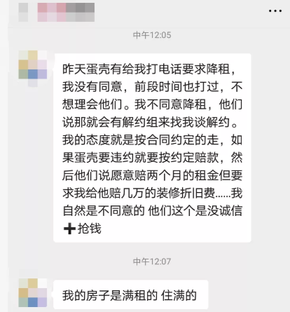 “如果要求降租,就好好协商。要解约可以,但须按照合同执行,不能一而再再而三骚扰房东。”深圳龙华区的一位蛋壳公寓房东告诉记者,现在感觉蛋壳公寓方面就是在变相“逼迫”房东降租,在很多房东明确不接受降租后,蛋壳公寓的工作人员提出的解约方案对房东非常不友好且涉嫌违反合同。