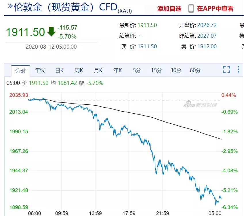 8月11日纽市盘中,金价暴跌,现货黄金重挫逾110美元,刷新近二周低点至1910.15美元/盎司,最深跌幅达5.78%,创2013年6月以来最大单日跌幅;白银跌幅一度达到15%,日内跌超4美元。