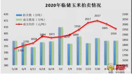 然而,进入8月份,国家开始调控。8月13日,国家临储玉米第12拍成交率依然为100%,但成交价格连续第二周回落,总体均价为1959元/吨,较上周下跌46元/吨,跌幅扩大至2.3%,近一个月以来首次回落至2000元/吨以下。