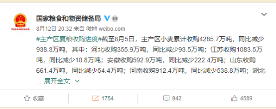 8月12日,国家粮食和物资储备局发布的一则“主产区夏粮收购进度”公告。其中提到,小麦产量占全国四分之一的河南省,夏粮收购总量为912.4万吨,同比减少538.8万吨。