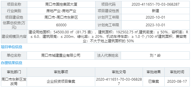 【大河财立方消息】8月17日,据河南省投资项目在线审批监管平台公示消息,周口市国控集团大厦项目获周口市东新区发改局备案,项目估算总投资60000万元。