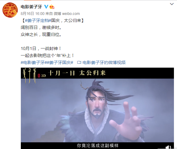 16日,《姜子牙》官方微博宣布电影将定档定档国庆档,将于10月1日正式上映。《姜子牙》由光线影业、彩条屋、中传合道出品。