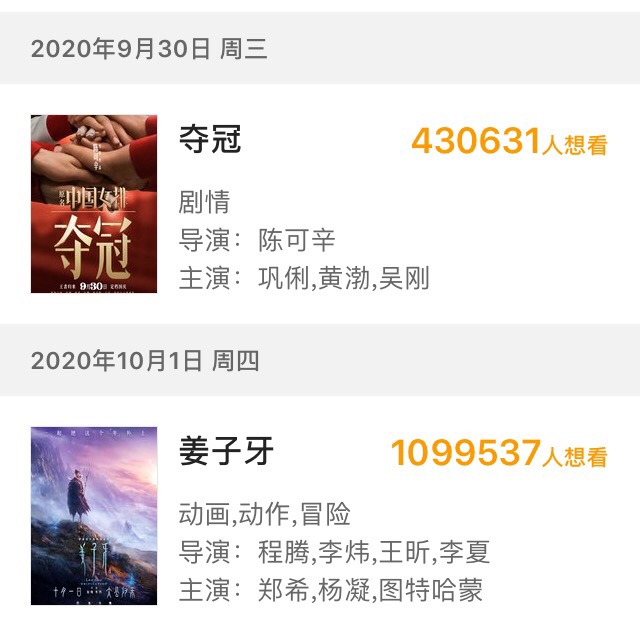 值得注意的是,8月17日,电影《夺冠》也宣布定档9月30日上映,成为继《姜子牙》之后,第二部杀入国庆档的“春节档”电影。