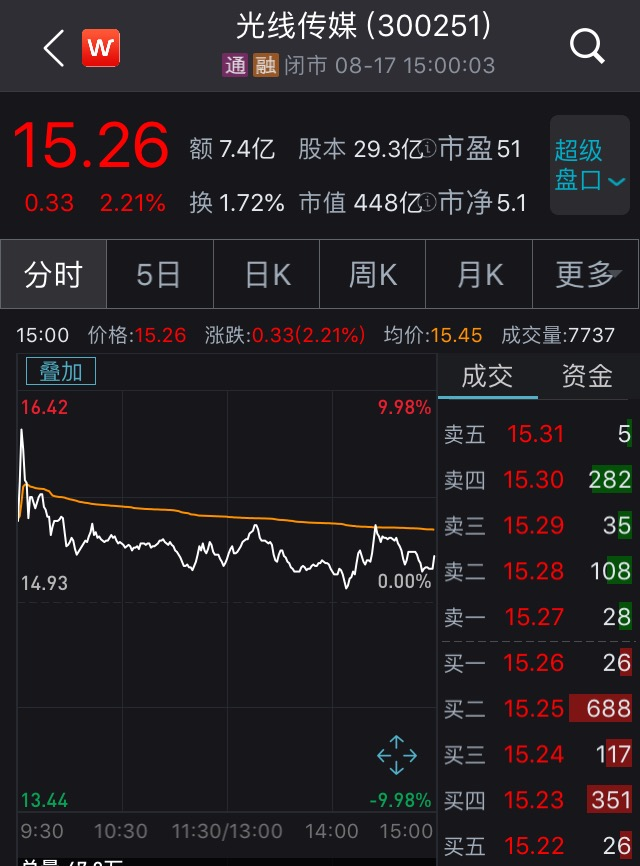 光线传媒(300251.SZ)作为《姜子牙》主要的出品方,在资本市场上引起的关注同样不小。17日,光线传媒高开高走,盘中一度触及涨停价16.42元,截至收盘报15.26元,最新总市值448亿元。
