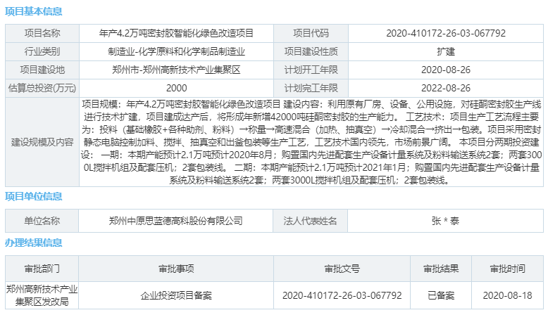 【大河财立方消息】8月18日,据河南省投资项目在线审批监管平台公示消息,郑州中原思蓝德高科股份有限公司年产4.2万吨密封胶智能化绿色改造项目获郑州高新技术产业集聚区发改局备案。