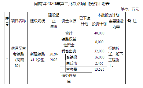 其中,铁路方出资0.8亿元,河南省出资3.2亿元。河南省出资部分中,河南铁投公司出资1.6亿元,商丘市2465万元,兰考县13535万元。