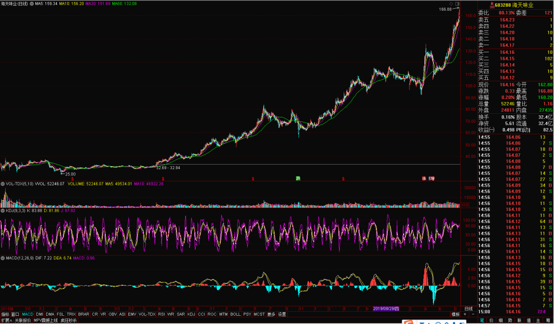 股市总是一个能制造“奇迹”的地方,8月18日,又一个“奇迹”发生了。当天,海天味业每股股价报收158.33元,总市值突破5000亿,达到5131亿元,超越了石油巨头中国石化4915亿元的总市值,升至A股第12位。