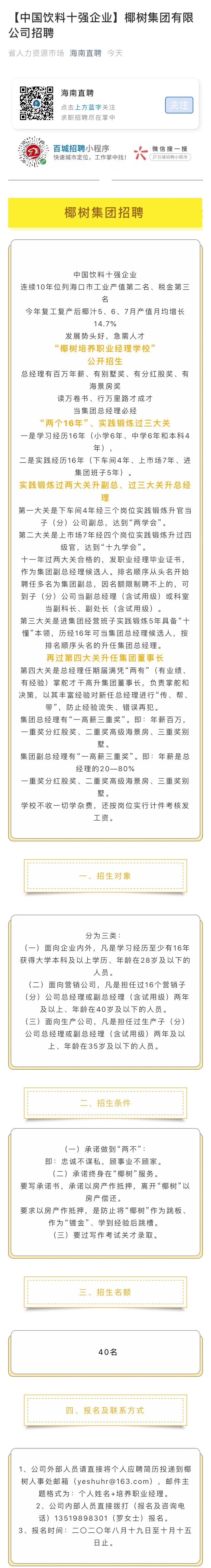 招聘启事显示,“椰树培养职业经理学校”公开招聘职业经理,待遇优厚。总经理有百万年薪、有别墅奖、有分红股奖、有海景房奖;副总经理年薪是总经理的20-80%,奖励分红股奖、海景房和别墅。