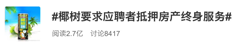 此消息一出,在网络上引发热议。#椰树要求应聘者抵押房产终身服务#这一话题登上热搜,截至目前,在微博阅读量2.7亿。