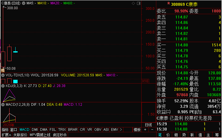 当然,康泰医学在向市场展示注册制下新股上市投资机会的同时,也向投资者展现了注册制下新股上市可能带来的投资风险。虽然面对康泰医学上市前两个交易日的表现,市场更多看到的是康泰医学的赚钱效应,实际上,康泰医学盘中的剧烈震荡也给市场带来了较大的投资风险。比如,在24日的尾盘交易中,康泰医学股价从308元快速跌至118元收盘,跌幅高达61.69%,对于追高买进的投资者来说,这个损失是惨重的。这就是新股上市没有涨跌幅限制所引发的结果,如果有44%的涨跌幅限制,就不会有这样的大幅震荡了。