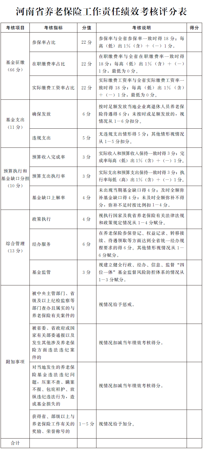 第十二条绩效考核采用百分制、量化评分的方式进行,得分为考核期内各项考核指标分值之和,详见《河南省养老保险工作责任绩效考核评分表》。