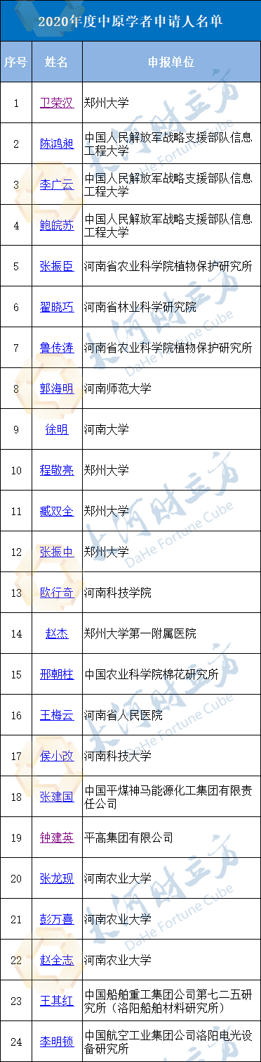 其中,2020年度中原学者申请人名单中,平高集团钟建英、中国平煤神马集团张建国、中航集团洛阳电光设备研究所李明锁等24人在列。