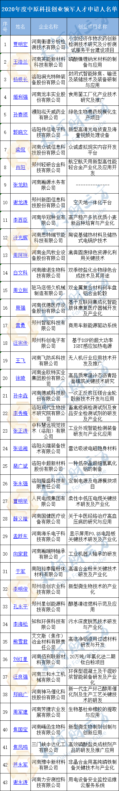 2020年度中原科技创业领军人才申请人名单中,河南英能新材料科技有限公司王浩兰、洛阳涧光特种装备股份有限公司杨根长、河南龙丰实业股份有限公司姬利强等43人在列。