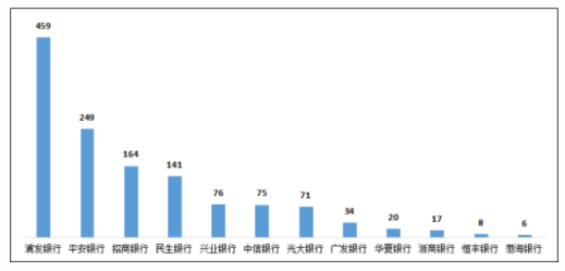 2.浦发银行、平安银行、招商银行的理财类业务投诉量位居股份制商业银行前三名。股份制商业银行理财类业务投诉量的中位数为73件。其中,浦发银行459件,占浦发银行投诉总量的12.7%;平安银行249件,占平安银行投诉总量的6.9%;招商银行164件,占招商银行投诉总量的3.1%;民生银行141件,占民生银行投诉总量的7.0%;兴业银行76件,占兴业银行投诉总量的2.0%;中信银行75件,占中信银行投诉总量的1.7%;光大银行71件,占光大银行投诉总量的3.0%;广发银行34件,占广发银行投诉总量的1.5%;华夏银行20件,占华夏银行投诉总量的2.6%;浙商银行17件,占浙商银行投诉总量的6.5%;恒丰银行8件,占恒丰银行投诉总量的7.4%;渤海银行6件,占渤海银行投诉总量的5.9%。
