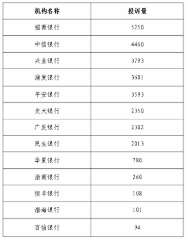 《通报》指出,国有大型商业银行投诉量的中位数为3182件。中国银行、工商银行、建设银行的投诉量位列国有大型商业银行前三名。股份制商业银行投诉量的中位数为2302件。招商银行、中信银行、兴业银行的投诉量位列股份制商业银行前三名。外资法人银行投诉量的中位数为13件。东亚银行、汇丰银行和渣打银行的投诉量位列外资法人银行前三名。