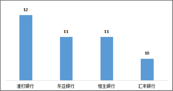 3.渣打银行、东亚银行、恒生银行的个人贷款业务投诉量位居外资法人银行前三名。外资法人银行个人贷款业务投诉量的中位数为10.5件。其中,个人贷款业务投诉量较多的为:渣打银行12件,占渣打银行投诉总量的38.7%;东亚银行11件,占东亚银行投诉总量的5.6%;恒生银行11件,占恒生银行投诉总量的84.6%;汇丰银行10件,占汇丰银行投诉总量的10.0%。