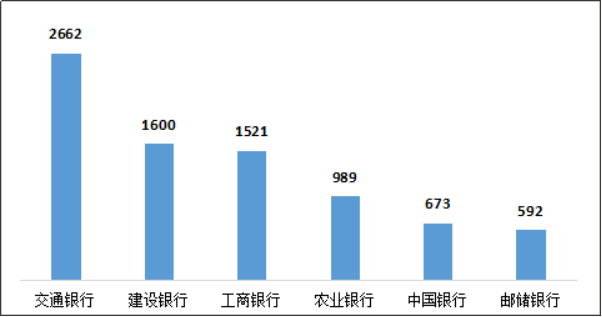 1.交通银行、建设银行、工商银行的信用卡业务投诉量位居国有大型商业银行前三名。国有大型商业银行信用卡业务投诉量的中位数为1255件。其中,交通银行2662件,占交通银行投诉总量的85.9%;建设银行1600件,占建设银行投诉总量的49.0%;工商银行1521件,占工商银行投诉总量的37.8%;农业银行989件,占农业银行投诉总量的39.1%;中国银行673件,占中国银行投诉总量的8.0%;邮储银行592件,占邮储银行投诉总量的27.0%。